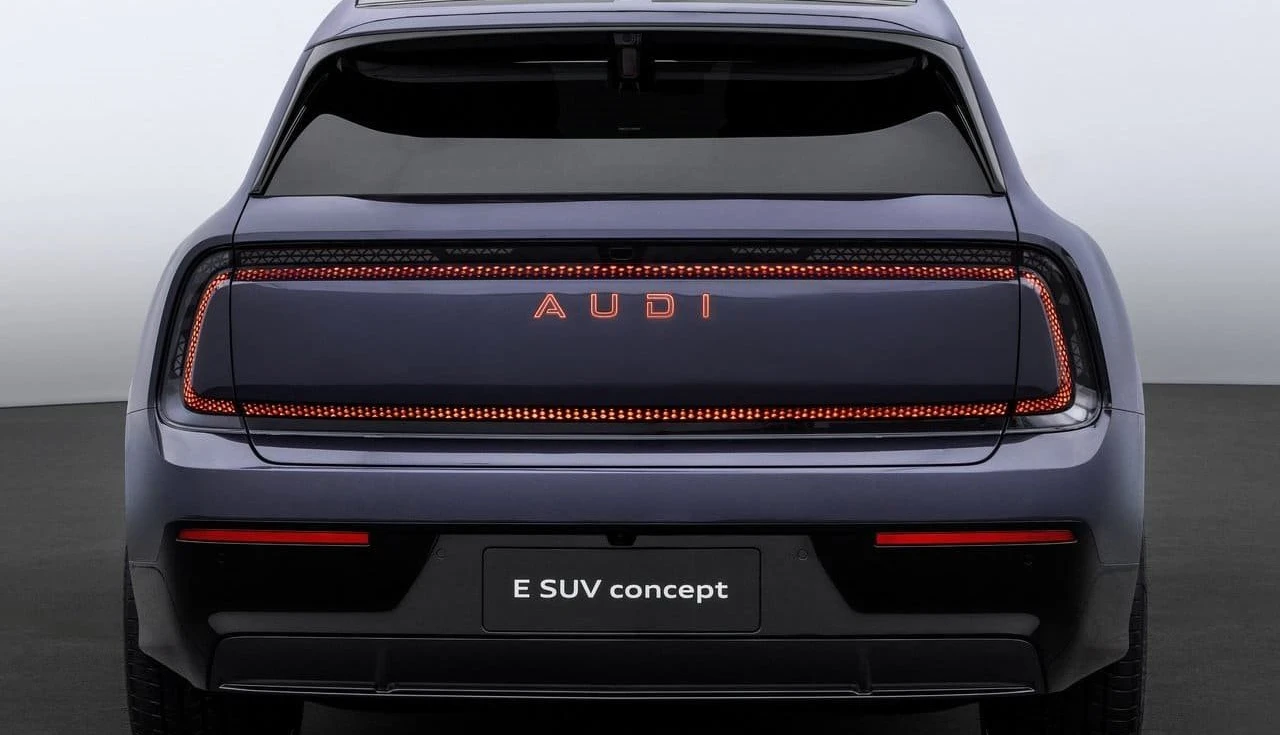 Visualmente, o E SUV Concept quebra todos os padrões da marca. A grade tradicional Singleframe sumiu. No lugar, entrou o AUDI Light Frame, um painel frontal com LEDs que cria um visual futurista.