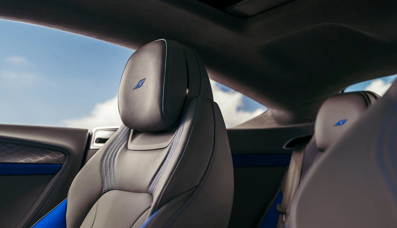Os bancos dianteiros têm design exclusivo com quilting canelado e bordados tridimensionais com o escudo “S”. O padrão bicolor (colour split) divide visualmente as seções internas em cores contrastantes — uma escolha estética reservada à família S.
