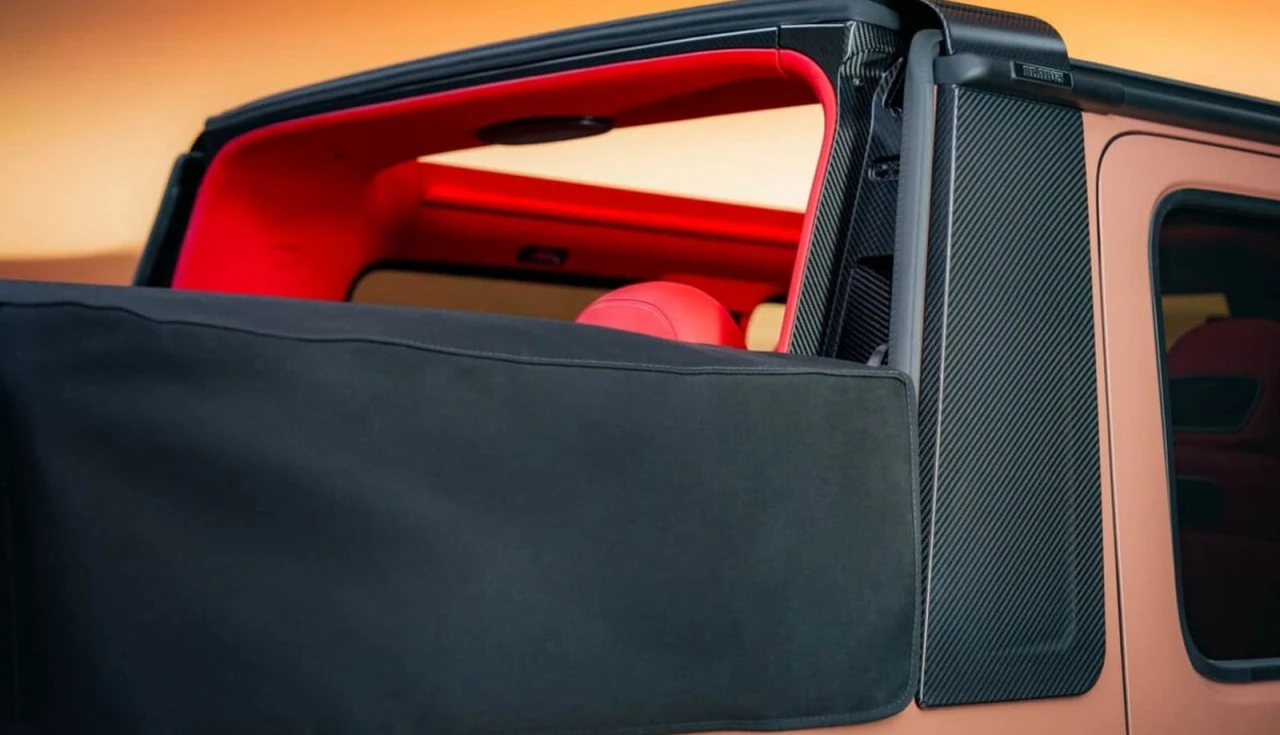 O arco frontal é feito em fibra de carbono e ajuda a reduzir o barulho do vento mesmo a 200 km/h. Na traseira, um rolo de segurança em aço garante proteção em caso de capotagem. Até cinco pessoas podem curtir a experiência de andar descapotado num G-Class.