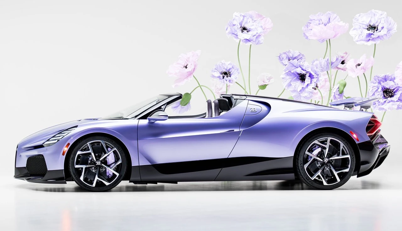 O Bugatti W16 Mistral ‘Caroline’ é único no mundo. Criado como tributo pessoal a uma filha, combina 1.600 cv com flores pintadas à mão e bordados em couro.