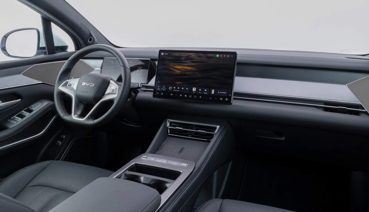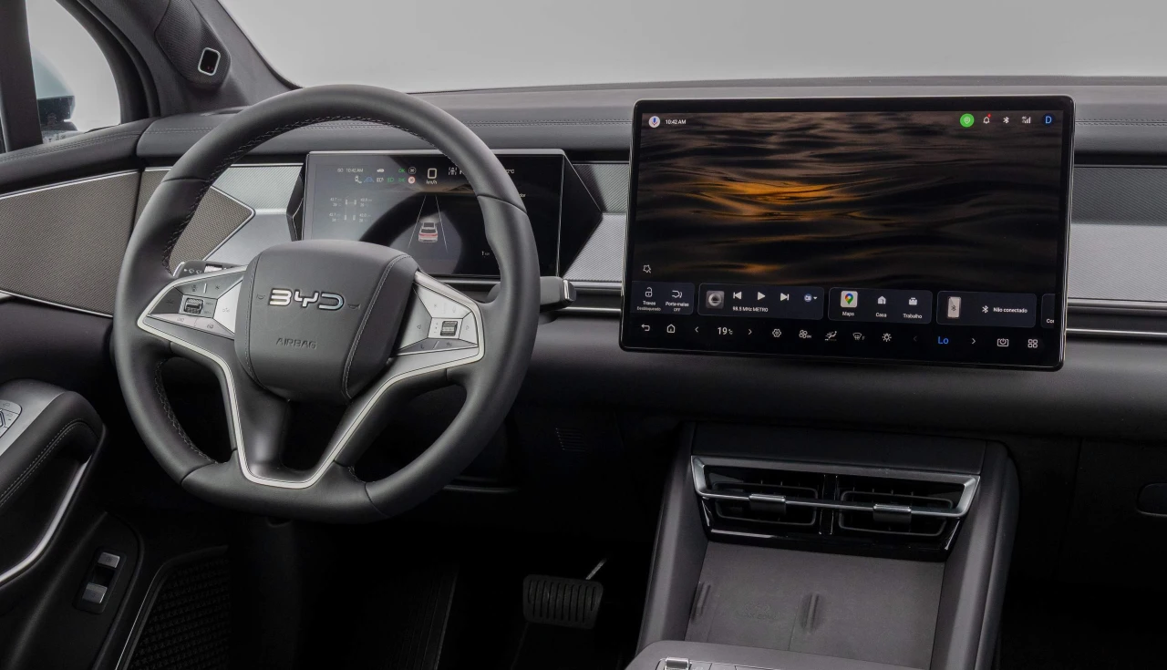 O teto é panorâmico, a tela central tem 15,6 polegadas (giratória, como já é tradição da BYD) e o som é assinado pela Dynaudio com 21 alto-falantes.
