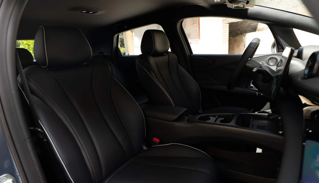 Os bancos são revestidos em couro vegano com perfurações para ventilação, um detalhe que faz diferença no clima brasileiro.