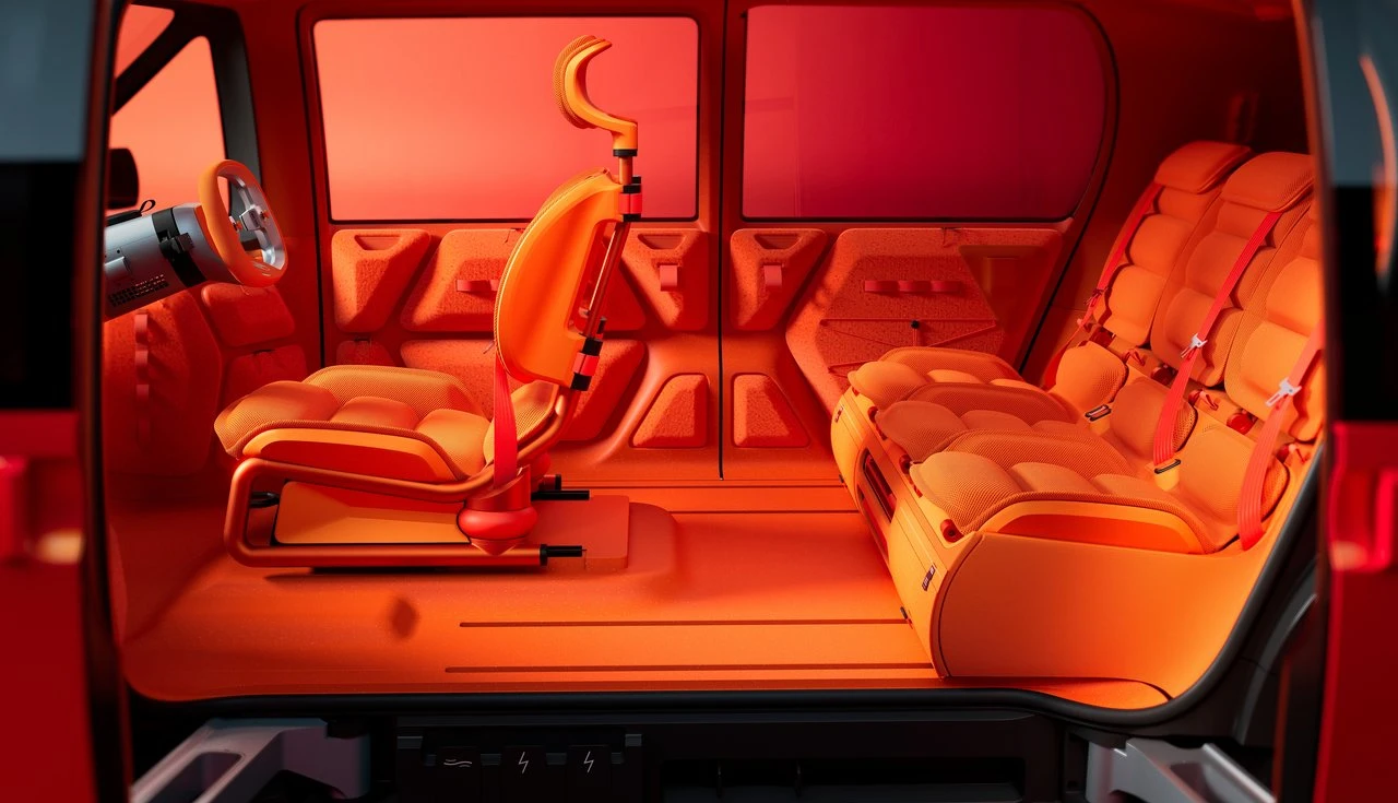 Os três bancos traseiros têm a mesma largura e são completamente removíveis. E aqui vem o detalhe genial: eles se transformam em poltronas confortáveis para usar do lado de fora. É uma referência clara ao lendário Citroën 2CV, que também tinha bancos removíveis.