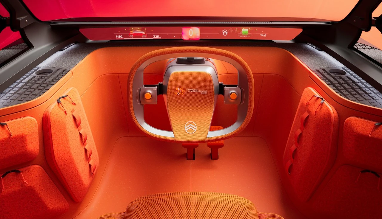 Esqueça o painel de instrumentos tradicional. O ELO usa um sistema onde informações coloridas flutuam através de toda a largura do para-brisa. É uma evolução do conceito “Smartband” que a Citroën apresentou no OLI de 2022.