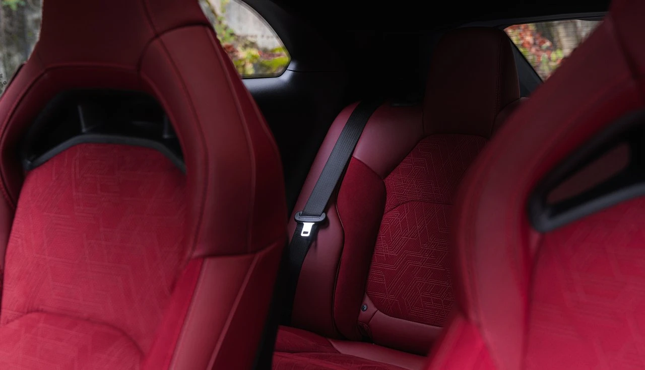 O volante tem base achatada na parte inferior, estilo competição. Os botões integrados controlam praticamente tudo – sistema de som, cruise control adaptativo, modos de direção e até as funções do painel digital. A posição de dirigir é baixa e envolvente, exatamente como deve ser em um carro esportivo.