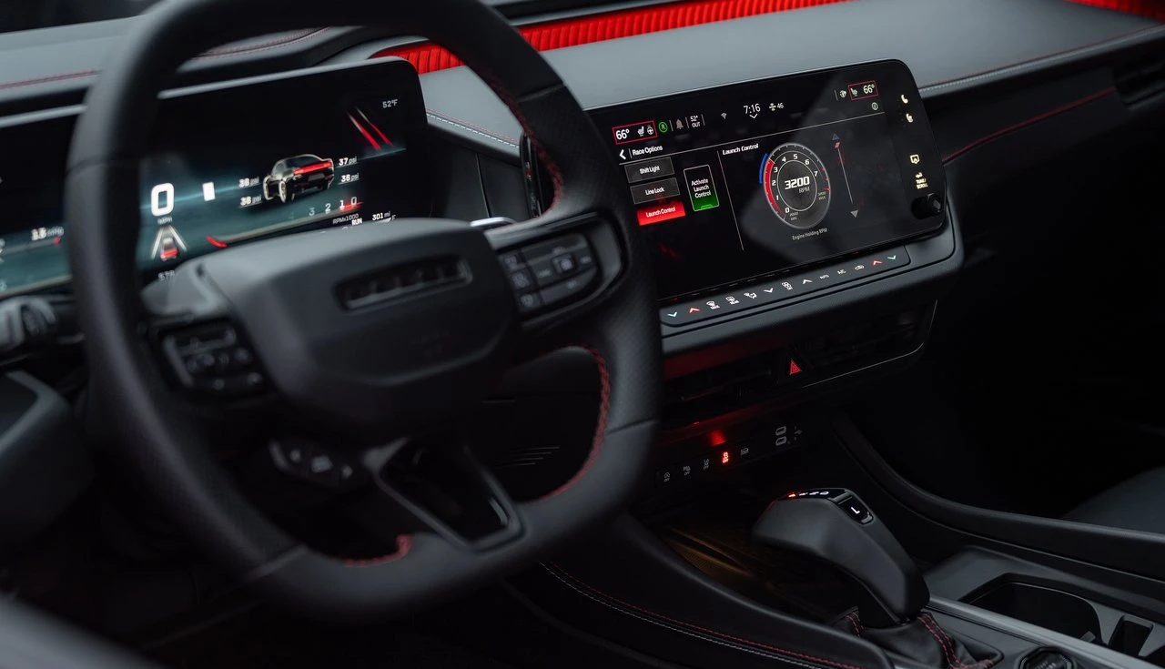 O painel adota design em camadas com inspiração retro-futurista. A Dodge manteve elementos visuais que remetem aos Chargers clássicos, mas tudo foi executado com materiais premium e tecnologia atual. O couro genuíno cobre os pontos de toque principais, enquanto detalhes em suede alcântara aparecem no volante e nos assentos.