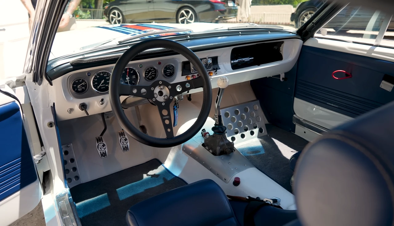 O cockpit traz bancos concha de época, cronômetros de rally clássicos e um seletor de freio ajustável. O destaque é a transmissão NASCAR exposta, permitindo ver as engrenagens em ação a cada troca.