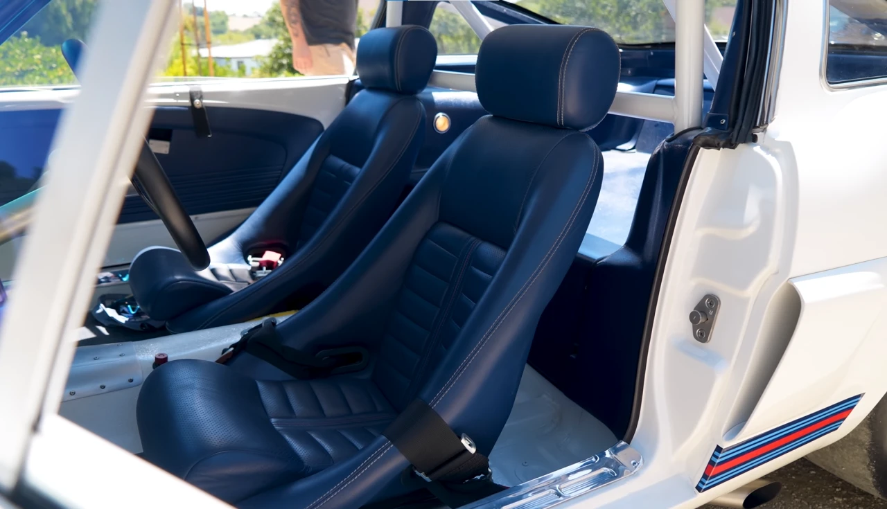 A icônica pintura Martini envolve uma carroceria com para-lamas alargados em aço e capô de fibra de vidro. Rodas de 16 polegadas com aperto central (knock-offs) completam o estilo agressivo e funcional de competição.