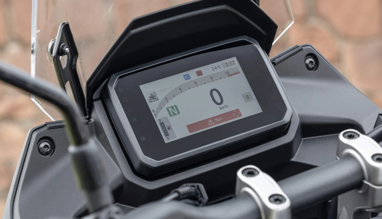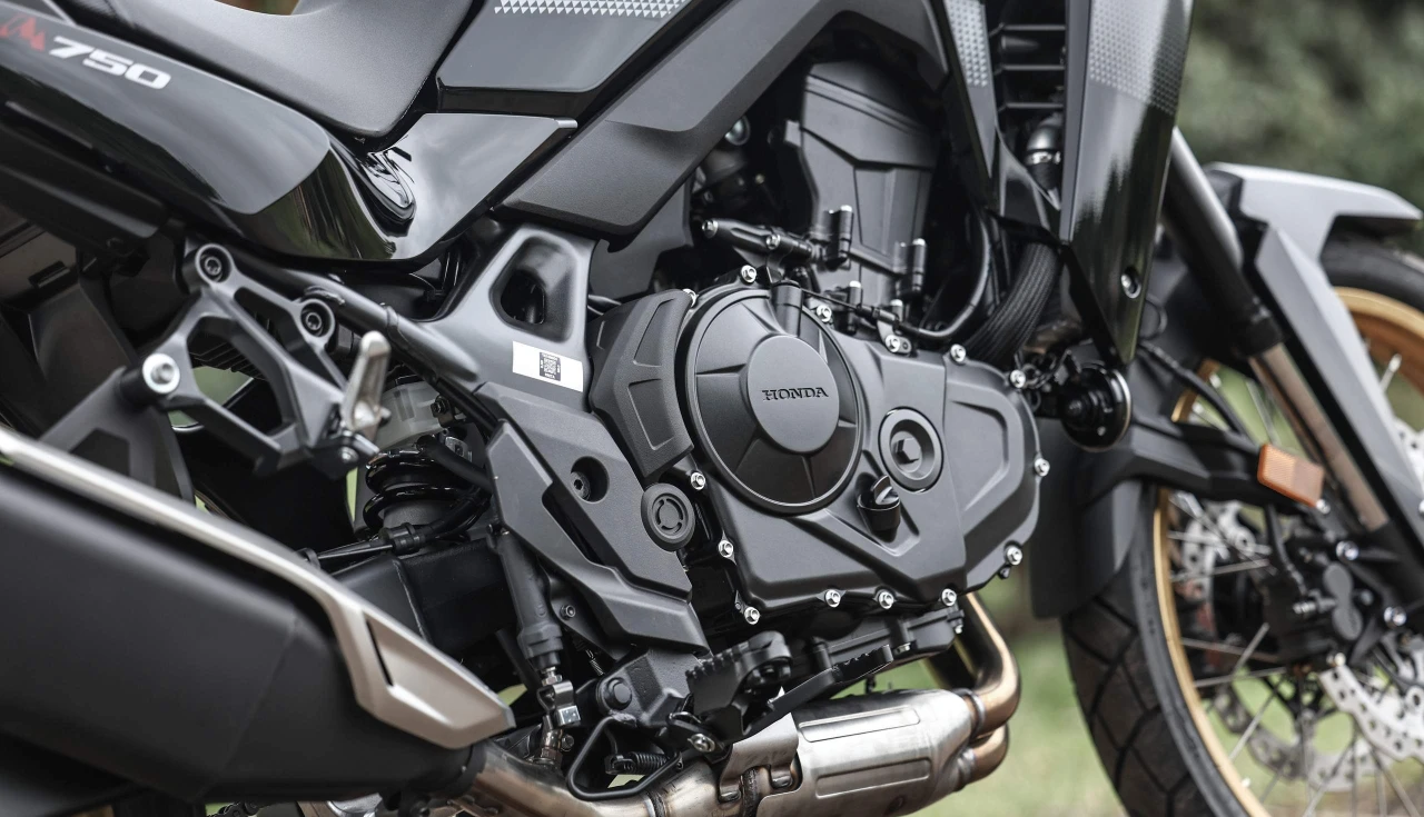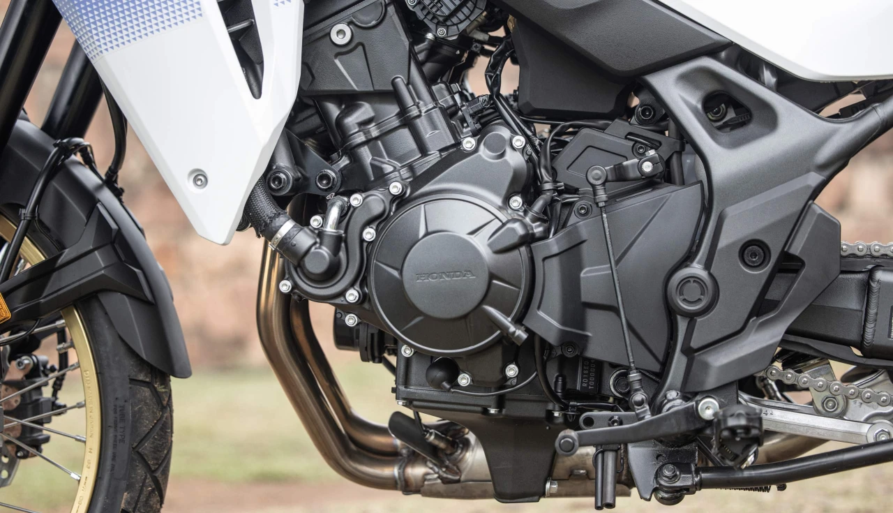 A Transalp traz um motor de 755 cc com 69,3 cv e 7,04 kgf.m de torque. Não é a mais potente do pedaço (a Suzuki V-Strom 800 lidera com 84 cv), mas compensa onde importa: consumo de 23 km/L na prática.