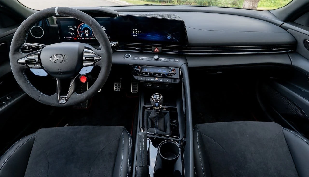 Ao abrir as portas do Elantra N TCR Edition, o condutor é imediatamente envolvido por um cockpit que respira competição. O volante revestido em Alcantara apresenta o característico marcador azul na posição 12h, além de botões N dedicados para acesso rápido aos modos de condução personalizados.