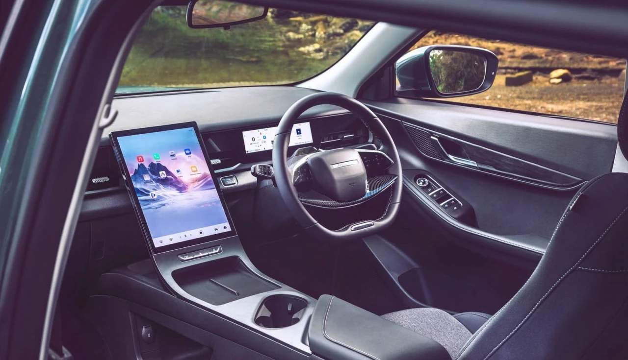 O painel é dominado por uma tela sensível ao toque de 13,2 polegadas em formato retrato. Abaixo dela, há duas plataformas duplas de carregamento sem fio de 50W com sistema de refrigeração para smartphones. O cluster digital do motorista tem 8,88 polegadas e prioriza informações de condução. O sistema aceita Apple CarPlay e Android Auto totalmente sem fios, e responde ao comando de voz “Hello Jaecoo”.