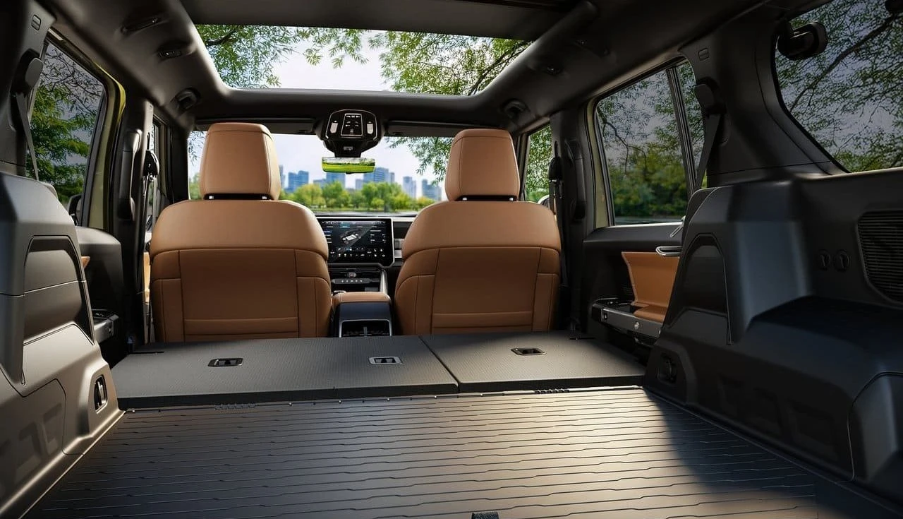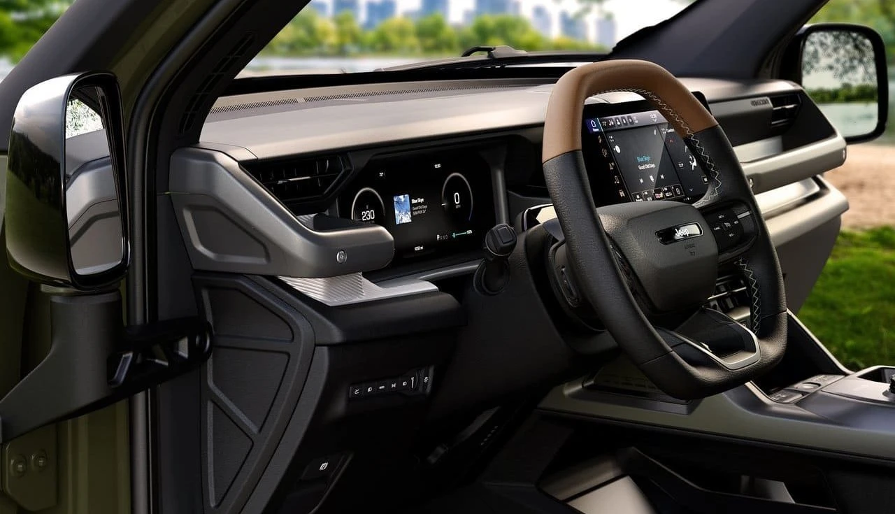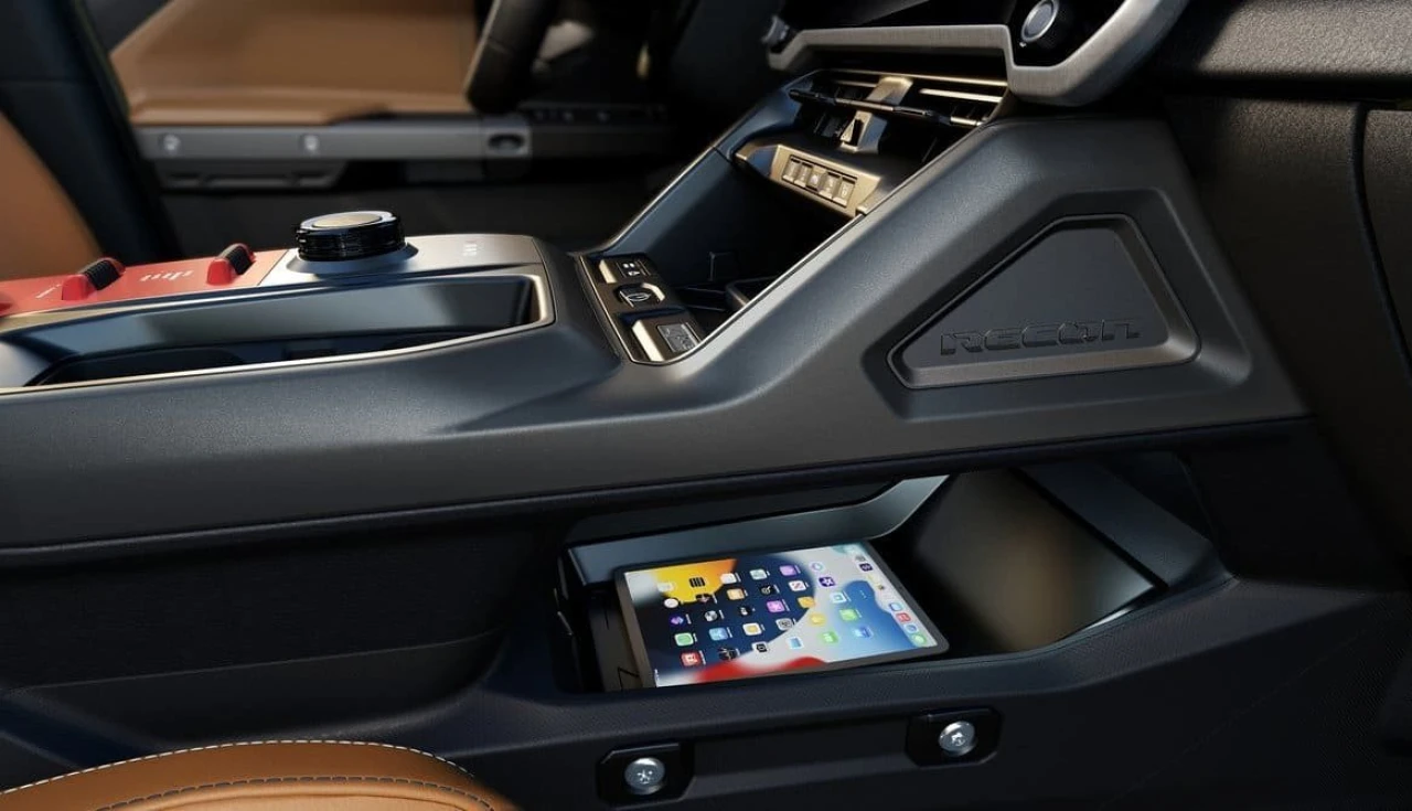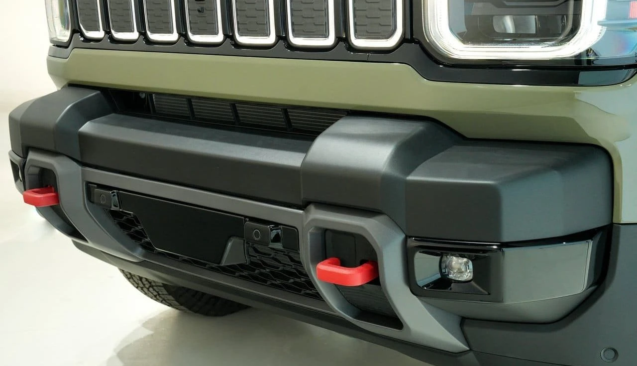 Visualmente, o Recon mantém aquela cara quadradona clássica, mas com um quê de nave espacial. A grade de sete furos iluminada agora tem LEDs, as lanternas traseiras lembram o Wrangler, e tem até pneu estepe no portão traseiro — coisa que concorrente nenhum faz.