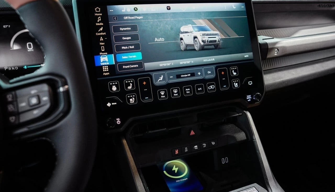 Tem Apple CarPlay sem fio, Alexa integrada, sistema de som Alpine com 11 alto-falantes, e até um app chamado Trails Offroad que mostra rotas de trilha nos EUA e Canadá inteiros.