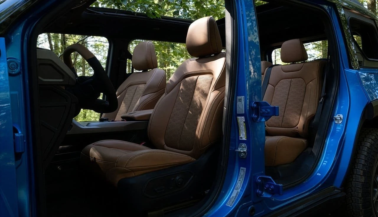 E aqui vem o melhor: portas que saem sem ferramenta. Você gira 90 graus e levanta. Pronto. Vidros laterais e traseiro também saem fácil. Quer sentir o vento na cara? Tem até opção de teto de lona elétrico.
