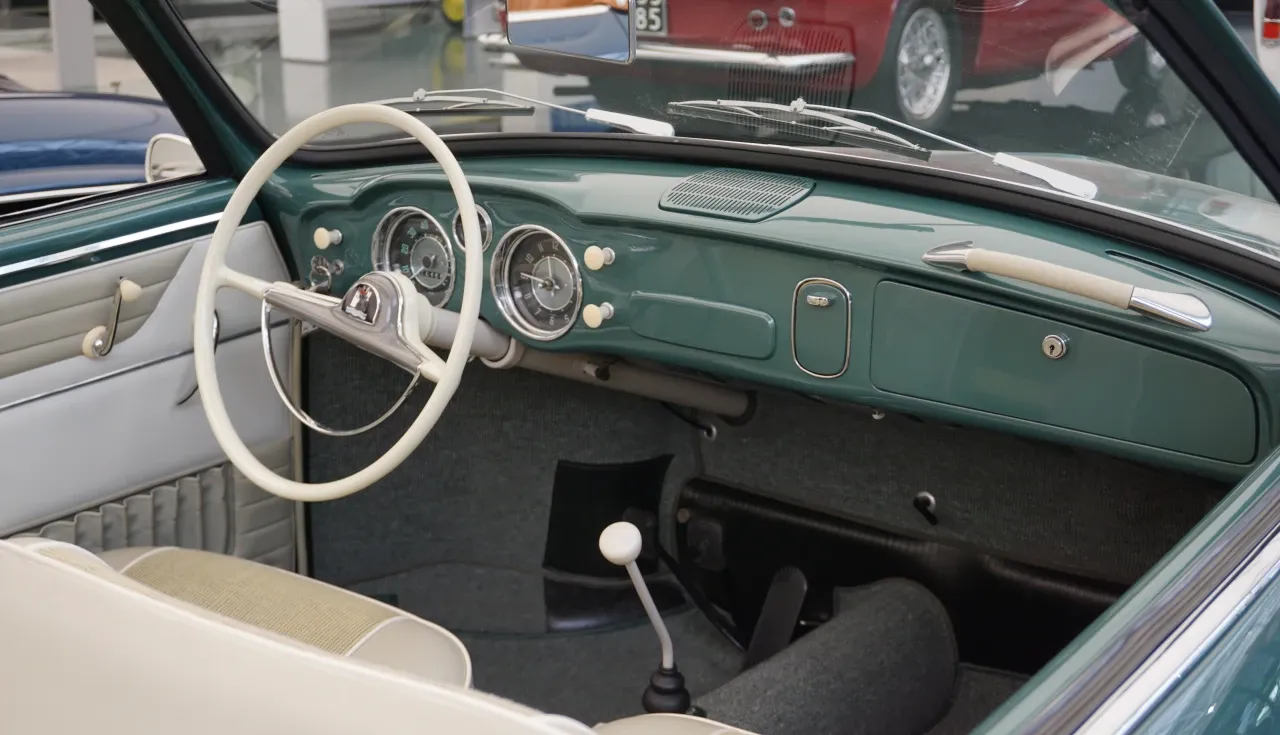 Com motor 1.2 boxer de 36 cv, tração traseira e câmbio manual de 4 marchas, o Karmann Ghia alcançava 120 km/h, oferecendo uma condução serena e refinada — um verdadeiro luxo acessível da década de 50.