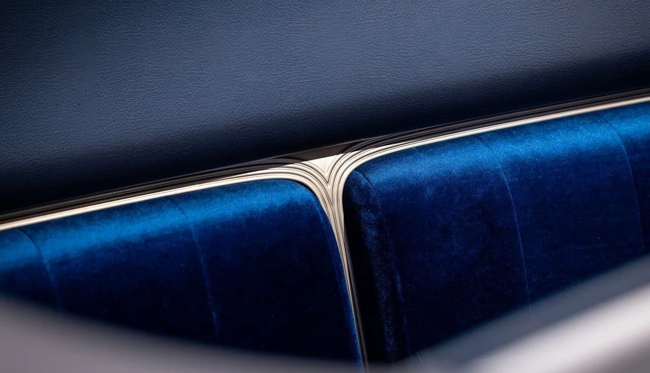 Os bancos dianteiros vêm revestidos em veludo azul profundo, remetendo aos luxuosos automóveis dos anos 1930. A configuração é interessante: um banco corrido para dois ocupantes, reforçando a simplicidade elegante e o foco na condução autônoma.