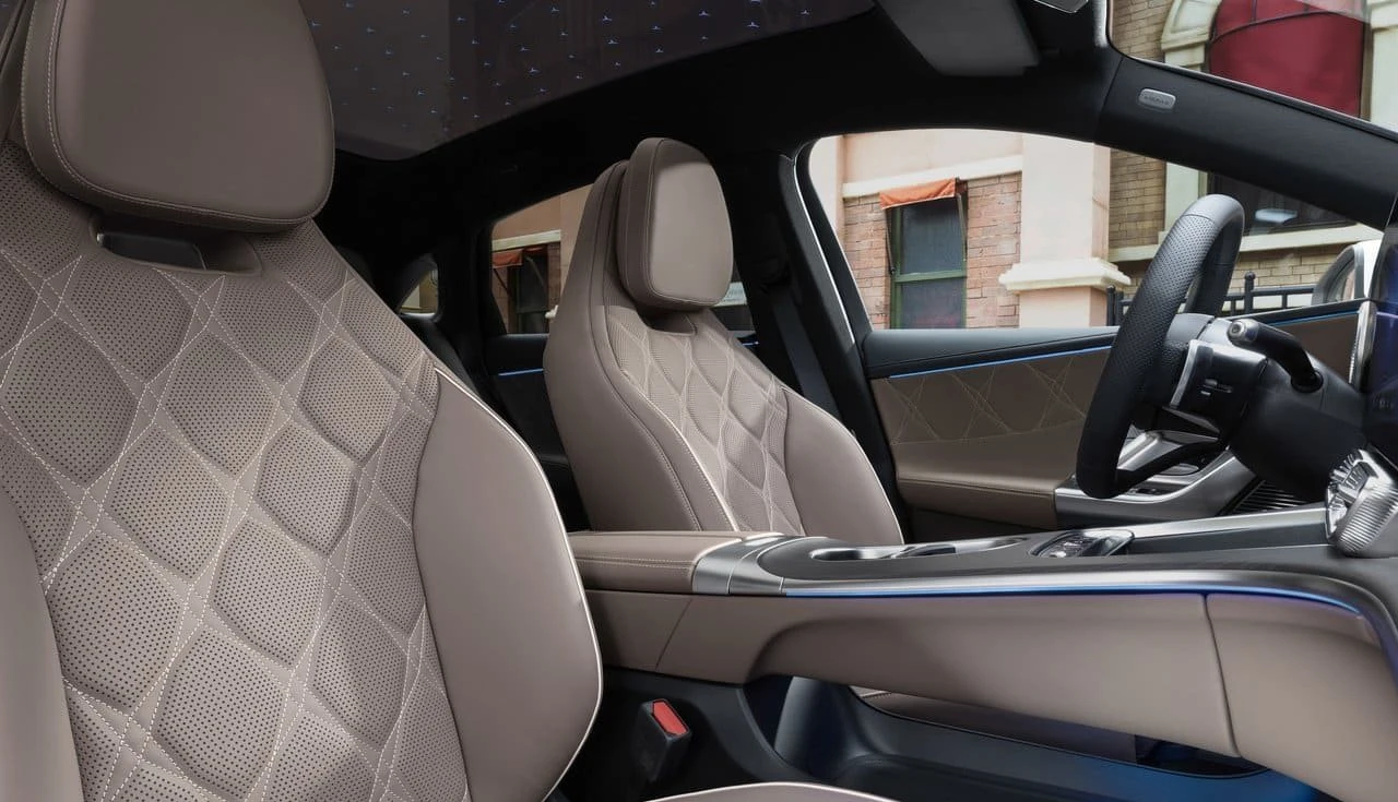 Os bancos dianteiros possuem certificação AGR alemã de suporte ortopédico. Incluem suporte lombar eletropneumático de 4 vias, sistema de massagem, aquecimento e ventilação ativa. O espaço para a cabeça cresceu 22 mm na frente e 10 mm atrás em relação ao modelo a combustão.