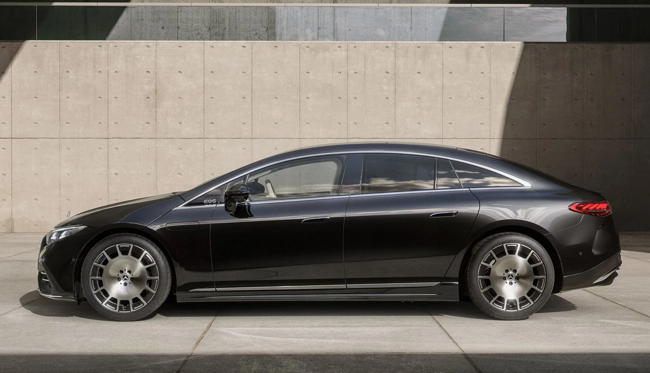 A silhueta do EQS segue o formato “One-Bow” — um arco contínuo do para-choque dianteiro até a traseira — que garantiu o coeficiente de arrasto de 0,20, um dos menores entre carros de produção no mundo. O resultado é um sedã alongado, com mais de 5.200 mm de comprimento e 3.210 mm de entre-eixos, que transmite uma presença grande, mas com proporções suaves.