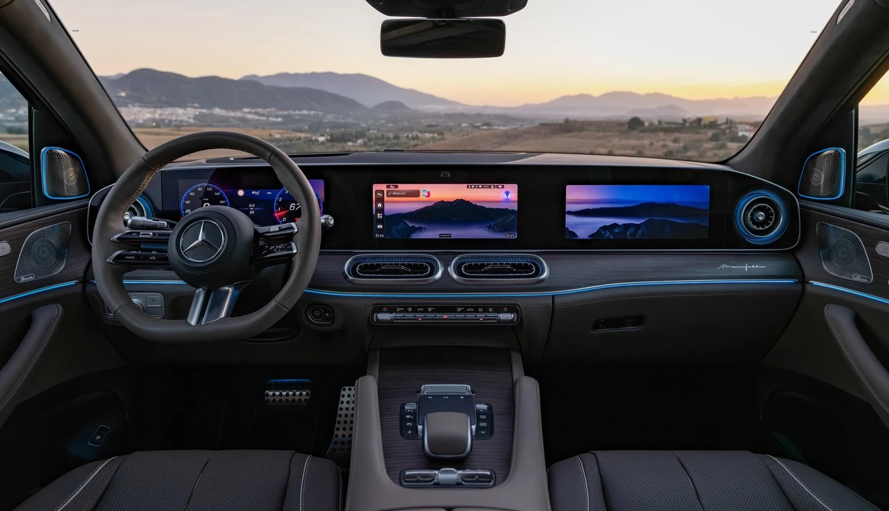 A MBUX Superscreen vem de série ou é opcional? De série. As três telas de 12,3 polegadas integradas ao painel são equipamento padrão em todas as versões do GLS 2027.