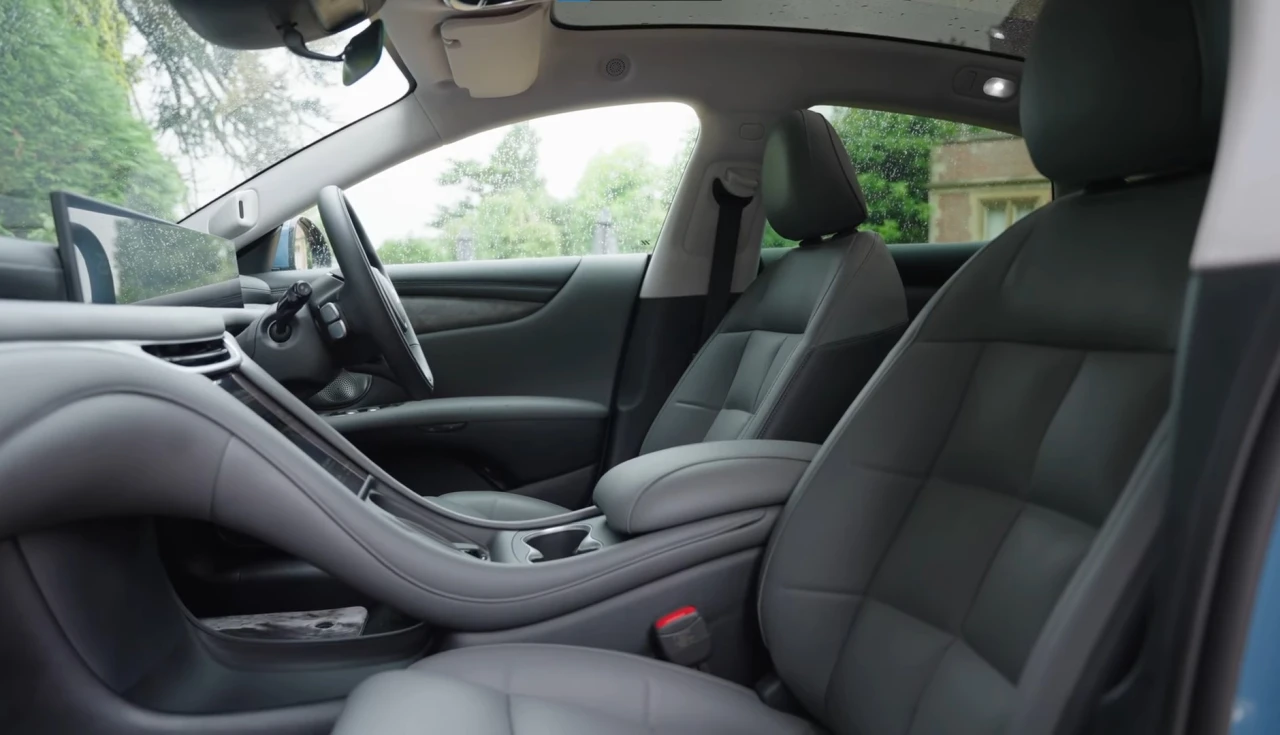 O habitáculo do MG IM5 lembra uma “business lounge” sobre rodas, com materiais premium e acabamento impecável. O painel é dominado por uma tela ultra-wide de 26,3 polegadas, que integra instrumentos, navegação e entretenimento.