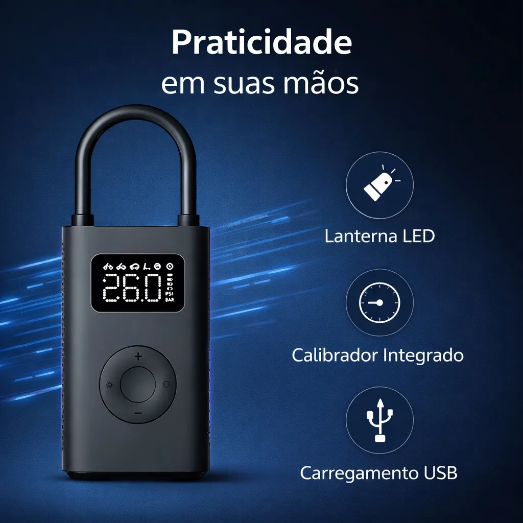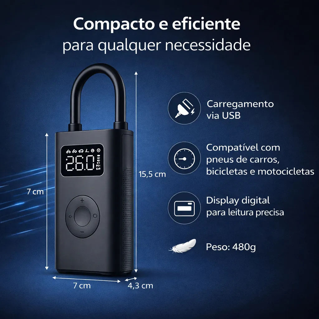 O Mini Compressor Digital Hold On é muito mais do que uma simples bomba de ar. É um equipamento compacto, leve e inteligente, projetado para inflar pneus de carros, motos, bicicletas, além de bolas e outros infláveis, com precisão e facilidade. Sua tecnologia digital permite ajustar a pressão desejada, garantindo uma calibragem perfeita e segura.