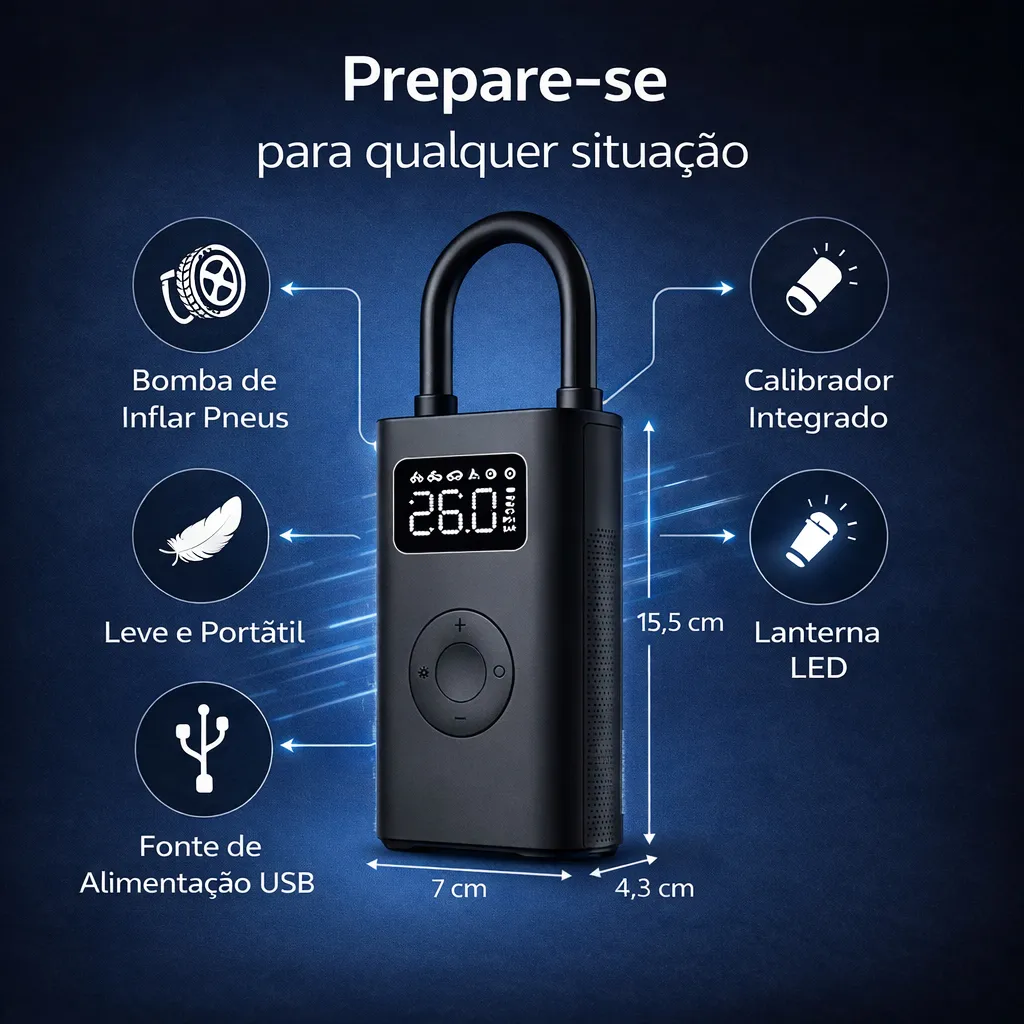 1.Portabilidade Total: Com um design ultracompacto, ele cabe facilmente no porta-luvas do carro, na mochila ou até mesmo na bolsa da bicicleta. Leve-o para onde quiser e esteja sempre preparado.