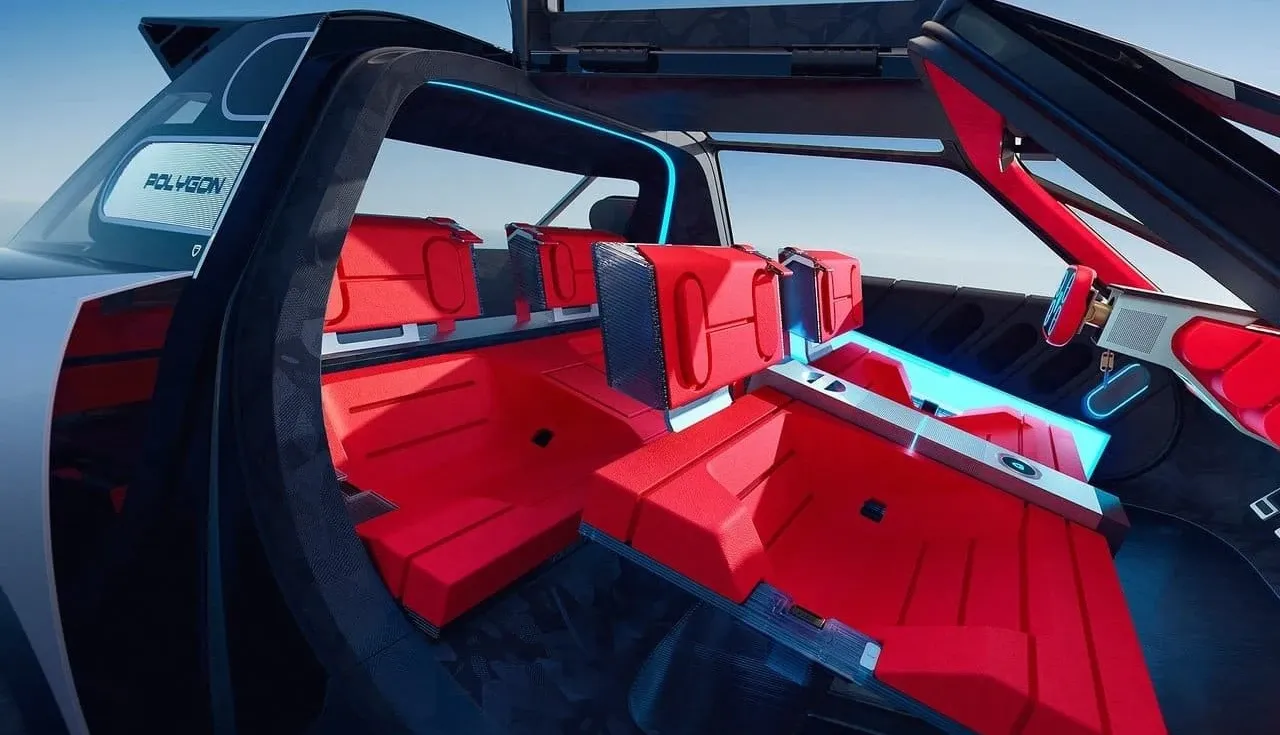 O Polygon eliminou todos os displays convencionais. O para-brisa inteiro vira uma tela gigante de 31 polegadas, graças a micro-LEDs posicionados atrás do volante.
