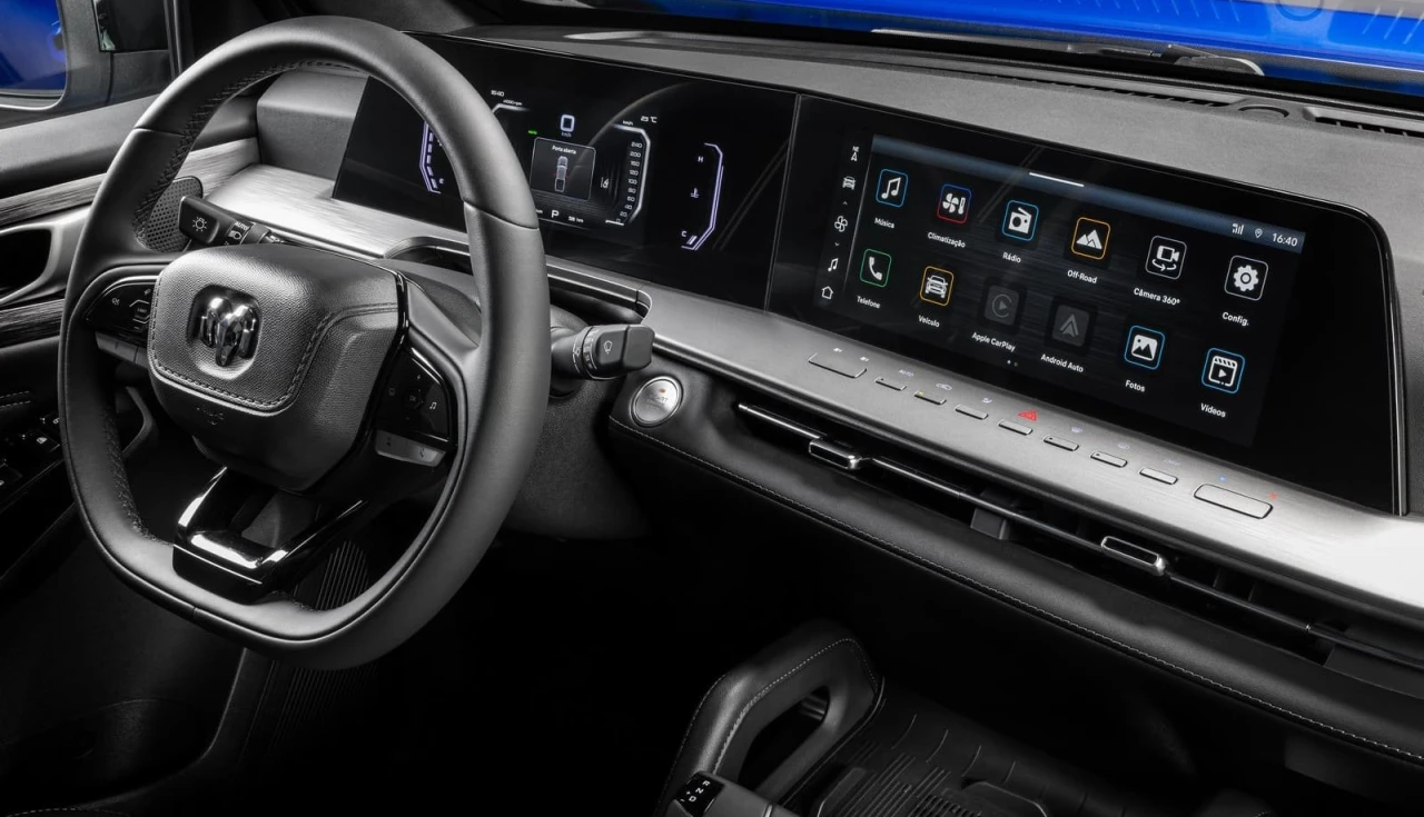 O ponto alto do interior é o sistema de câmeras 360 graus com função “chassi transparente”, que usa processamento de imagem para mostrar o que está logo abaixo do motor. Em manobras urbanas ou em trilhas, essa tecnologia se torna uma referência prática no segmento.