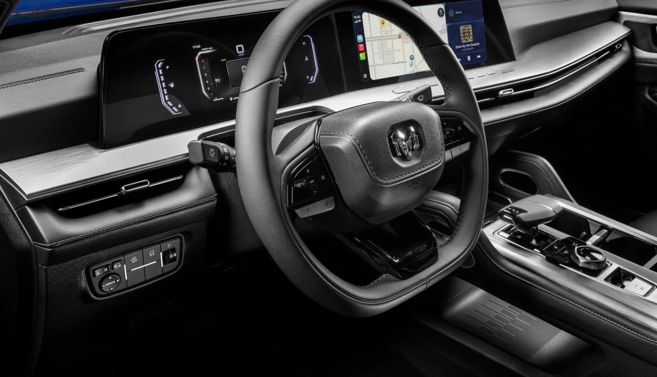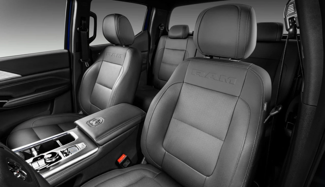 Os bancos são revestidos em couro preto com o logotipo Laramie bordado. O assento do motorista e do passageiro oferecem ajuste elétrico de até 10 vias, além de ventilação e aquecimento. Para viagens longas, esse conjunto representa conforto real, não apenas estético.