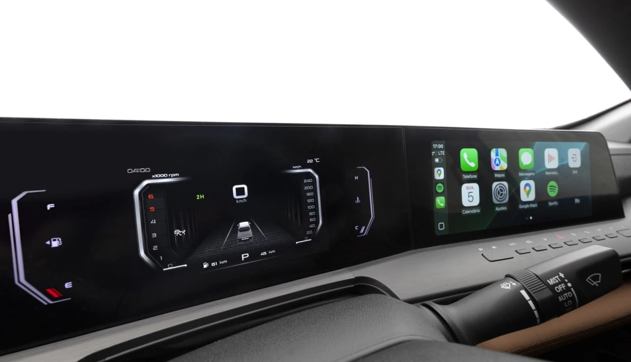 A central multimídia de 12,3 polegadas vem com Android Auto e Apple CarPlay sem fio. Sim, sem cabo nenhum. O painel digital complementa as telas e deixa tudo moderno.