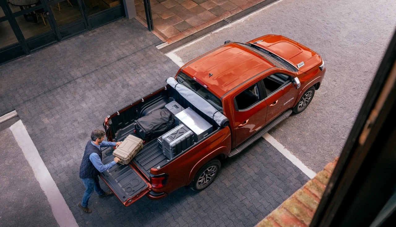 A caçamba oferece 1.210 litros de espaço, com iluminação LED interna e externa. A capacidade de carga é de 1.020 kg e ela reboca até 3,5 toneladas.