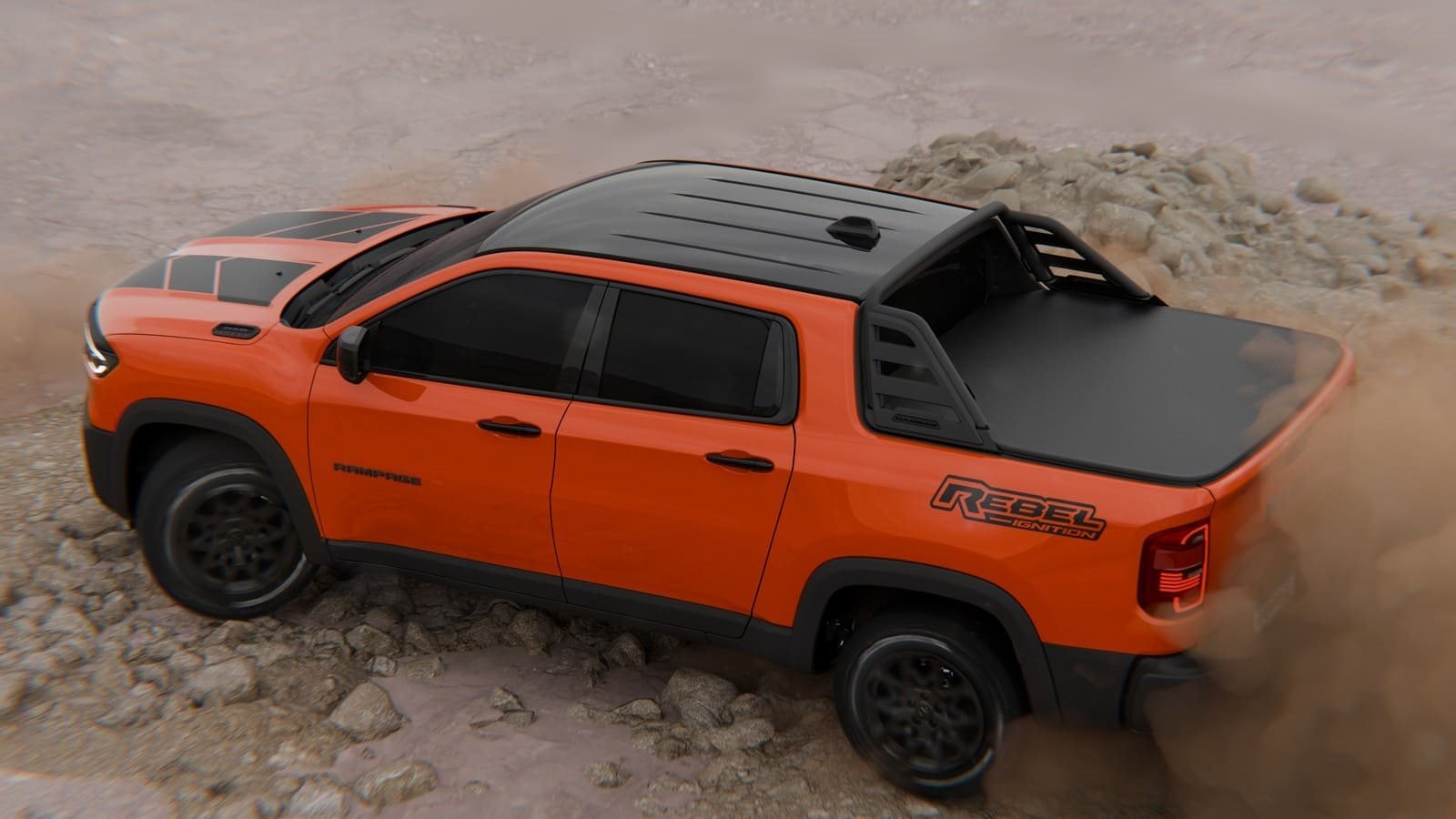| 1. Cor Exclusiva | A Rampage Rebel Ignition é pintada na exclusiva cor Laranja Ignition, inspirada na RAM 1500 TRX Ignition Edition lançada nos Estados Unidos. |