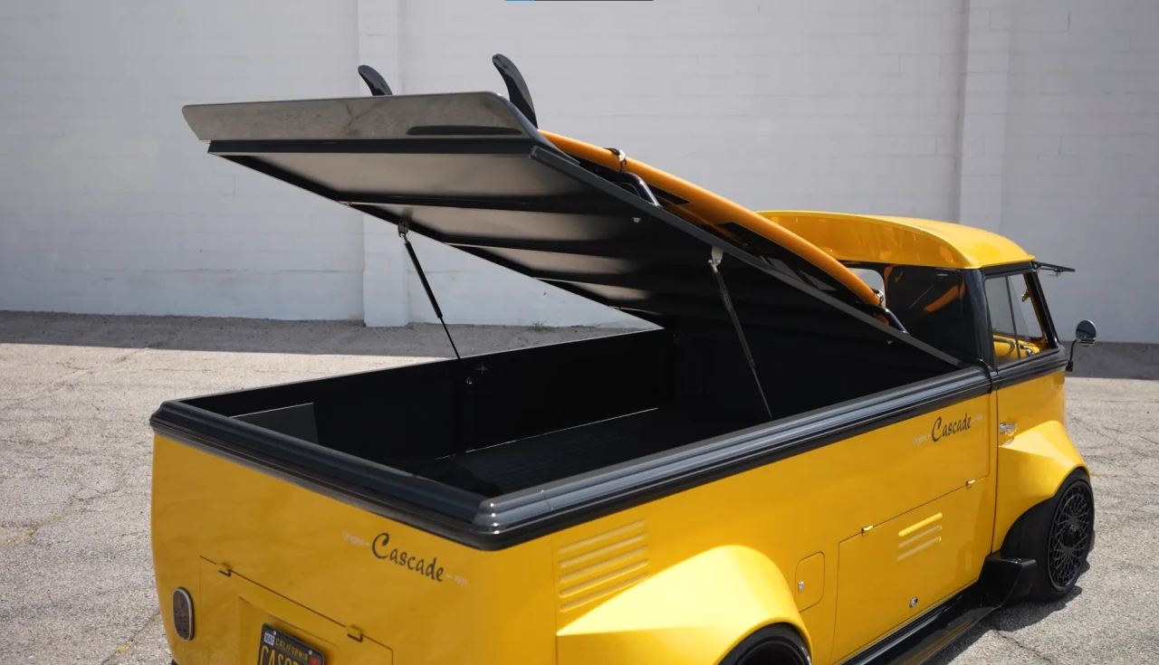 Se o frontal já chama atenção, a traseira do VW Widebody é simplesmente deslumbrante. Tudo a partir da linha da cabine foi refeito em fibra de vidro, incluindo uma tampa de carga inteiramente nova – um trabalho de Kenny Fitzer que exigiu precisão milimétrica. O spoiler integrado ao tanque combina com a linguagem aerodinâmica do conjunto, enquanto as luzes traseiras originais mantêm o DNA vintage.