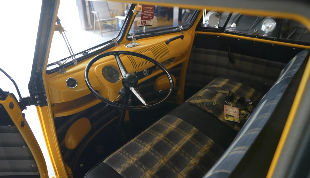 Ao entrar no Volkswagen Truck Widebody, a primeira impressão é de estar em uma máquina do tempo com toques modernos. O banco do motorista, embora mantenha o design original, foi revestido em flanela personalizada, combinando perfeitamente com a estética descontraída do projeto. Apesar de não ter cintos de segurança (um detalhe que reforça o estilo “old school”), a posição de dirigir é surpreendentemente confortável, mesmo com o volante clássico de madeira e metal.