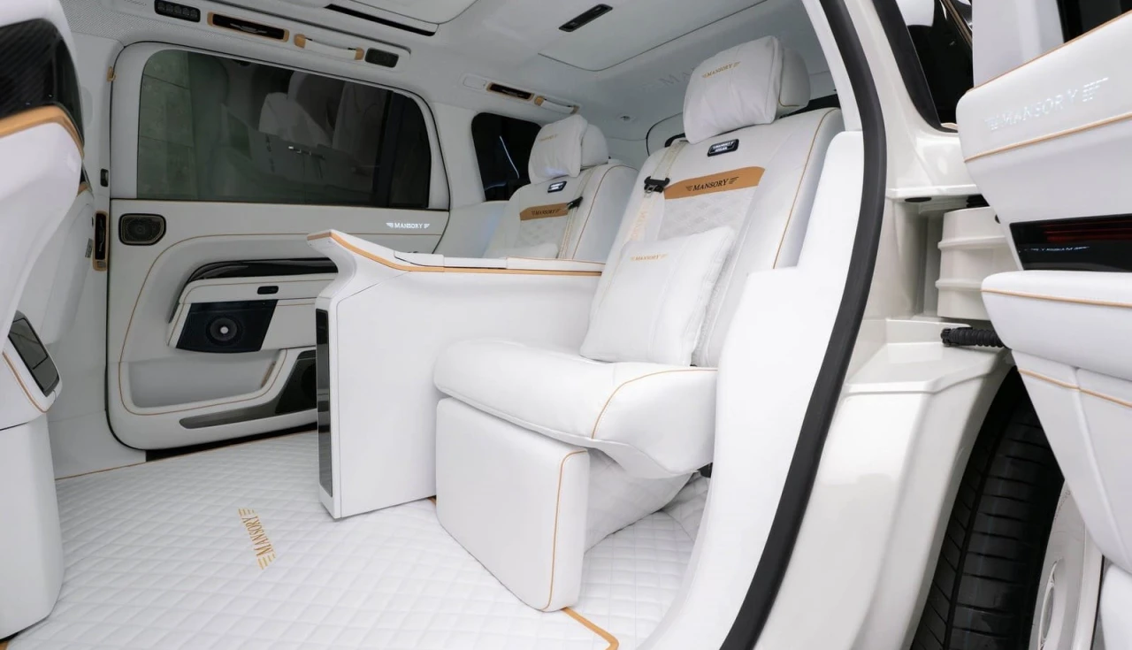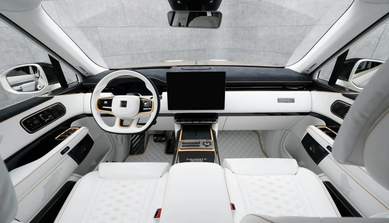 A Mansory substitui praticamente todos os revestimentos visíveis. Couro branco de alta qualidade, costuras e detalhes em dourado, inserções em fibra de carbono e Alcantara preta no painel e console. Bancos, volante, forros de porta e túnel central recebem esse tratamento. O layout de telas e comandos não muda, apenas o acabamento.